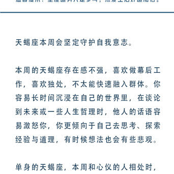 10.14周一,水星进入天蝎座,日木拱,日火刑。今天你的洞察力和思想深度会有所提升,也能更加乐观地面对所有事情,不过需要避免任性冲动、乱发脾气。