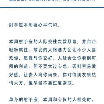 10.18周五,金星进入射手座。今天你可以敞开自己,去尝试各种新鲜玩意儿,多重视生活的体验。